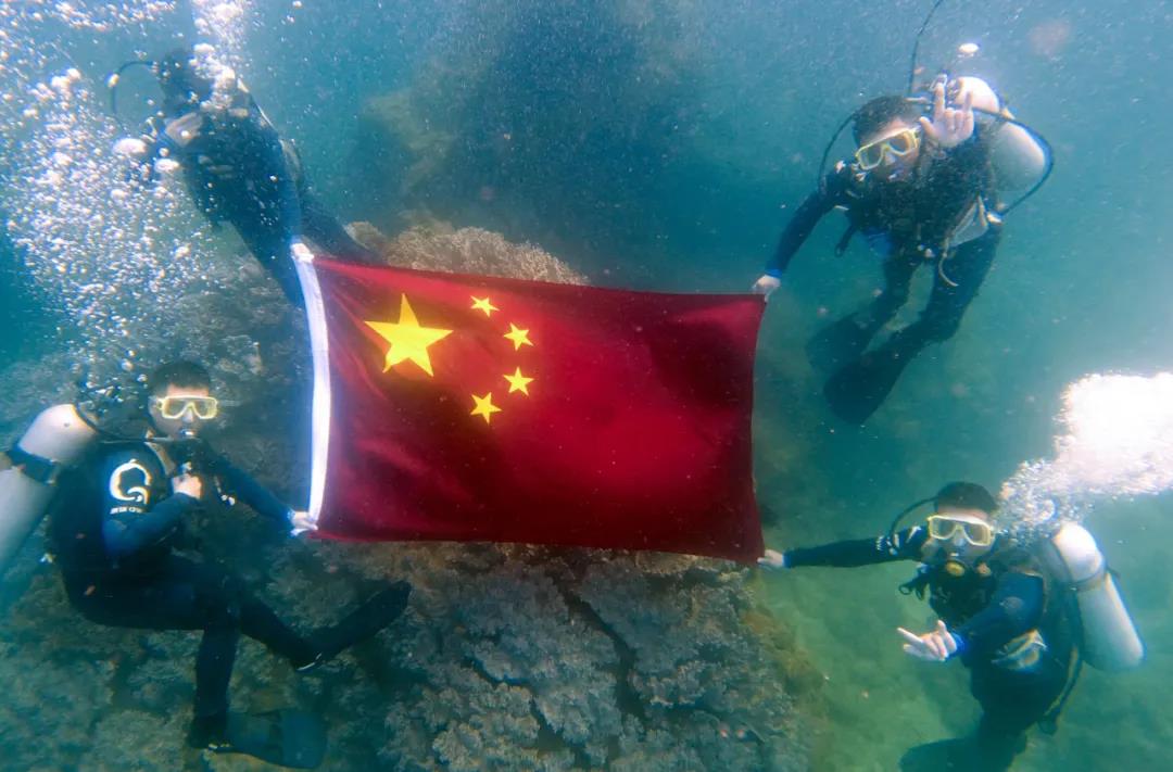 △海南三亞蜈支洲島海域,游客水下展開國旗合影留念。