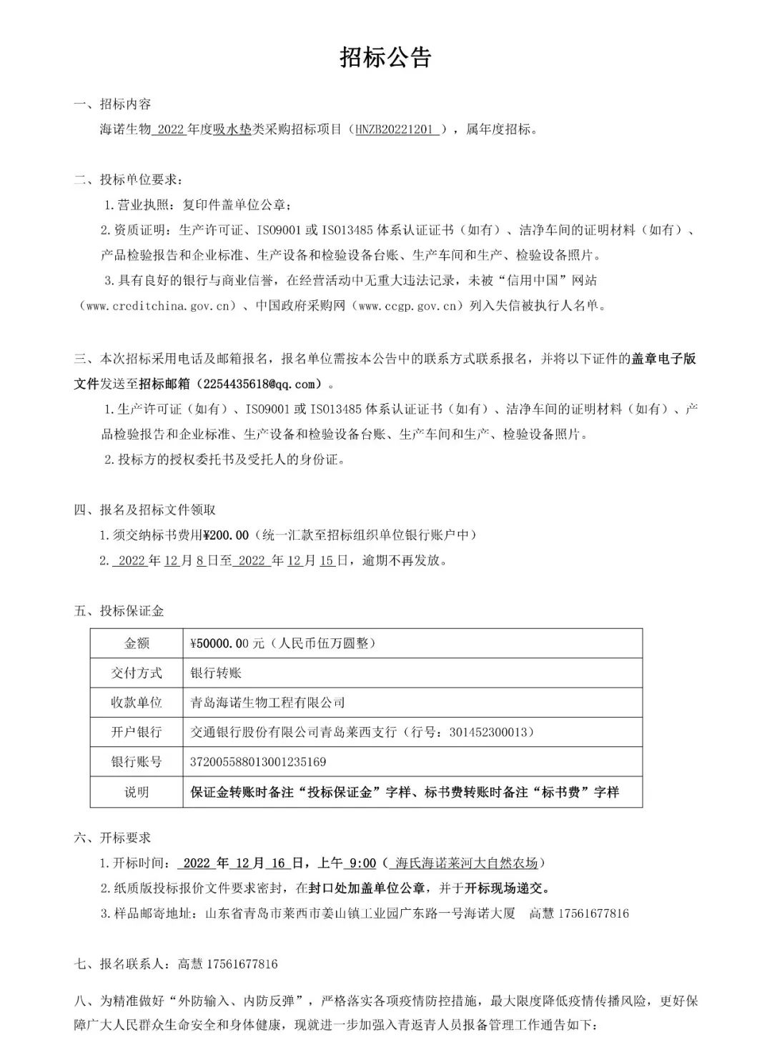 海諾生物2022年度吸水墊類采購(gòu)招標(biāo)項(xiàng)目正式開(kāi)啟