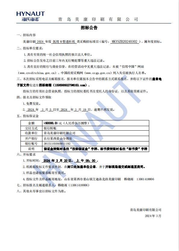 2024年度美康印刷透析紙采購(gòu)招標(biāo)項(xiàng)目招標(biāo)公告